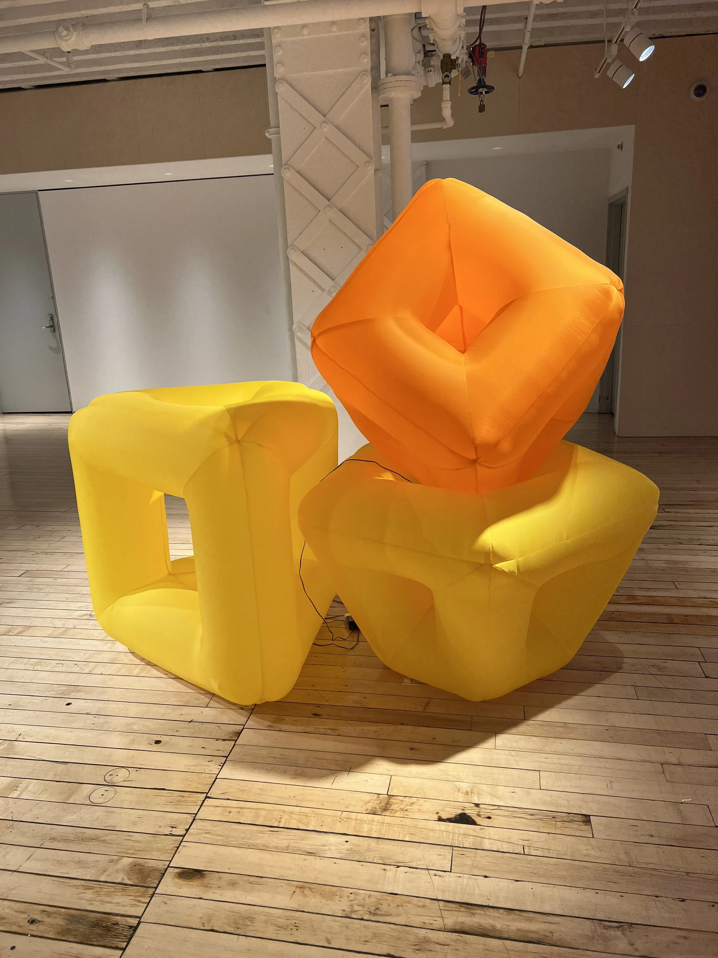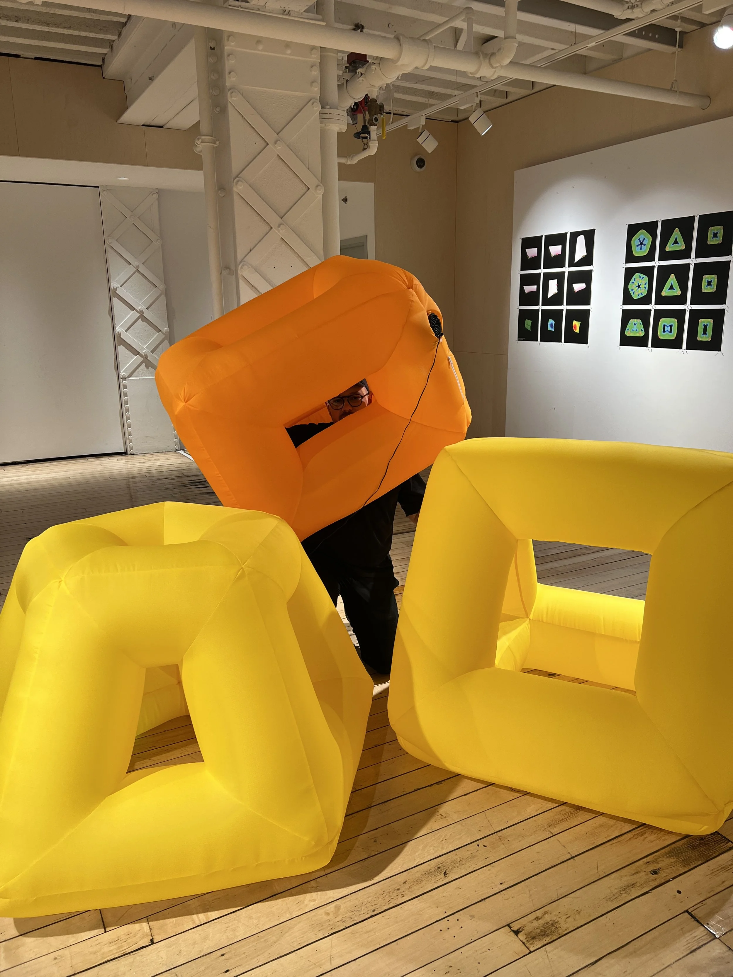 Rooted in a proto-architectural ethos, Pneumatic Forms blurs disciplinary boundaries, oscillating between the domains of architecture, wearable art, and objecthood. Each form beckons interaction, inviting viewers to engage physically and conceptually with its evolving geometric configurations and spatial narratives. By merging the ephemeral qualities of inflated structures with the structural precision of Gaussian geometries, the installation prompts contemplation on the interplay between materiality, form, and experiential space.